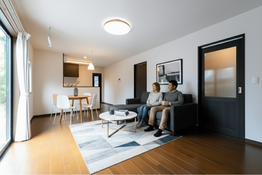 黒×木目で一体感のある室内は