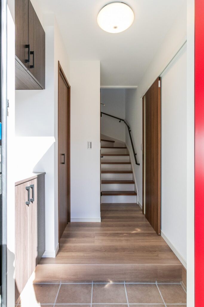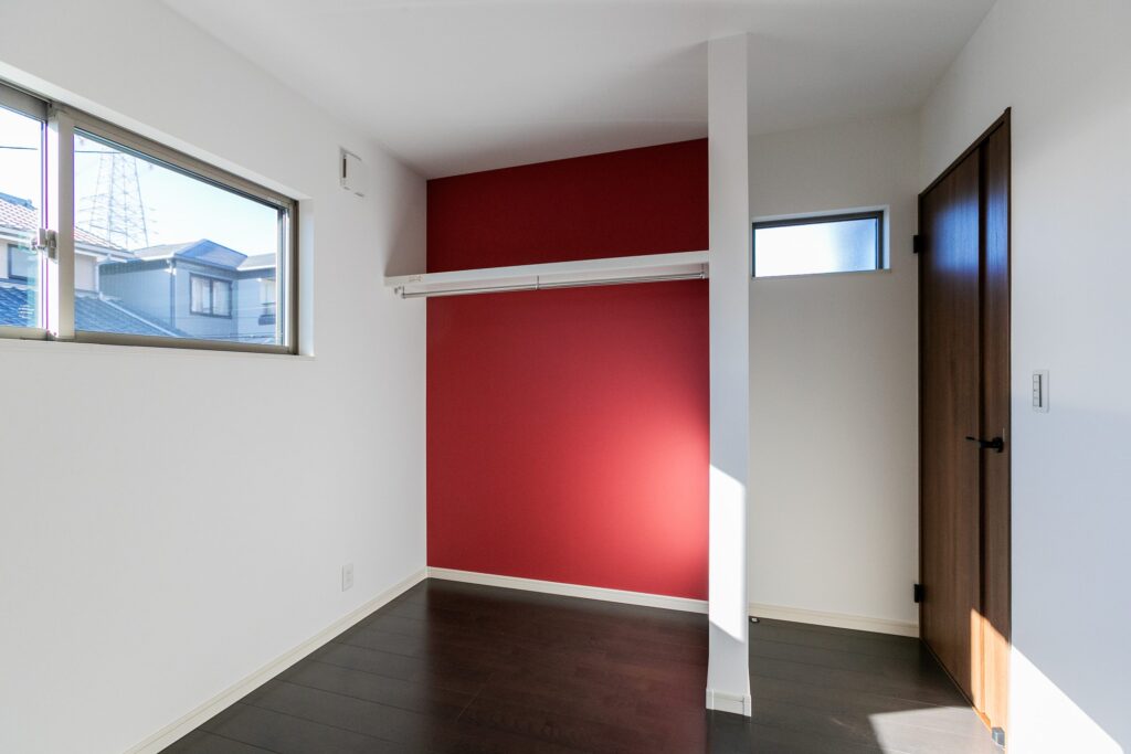 「赤い玄関ドアがアクセントのモダンな2階建て(34坪112.62㎡)」