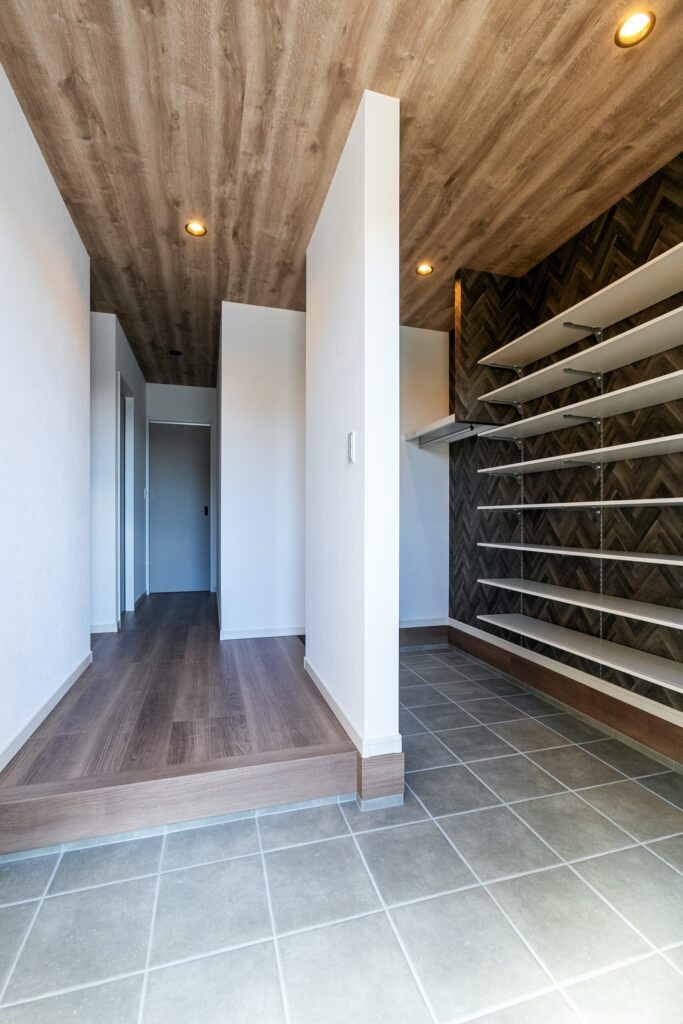 壁一面を使用した、見せる収納がある3.5帖の広い玄関は見せる収納でおしゃれかつ通気性も抜群!