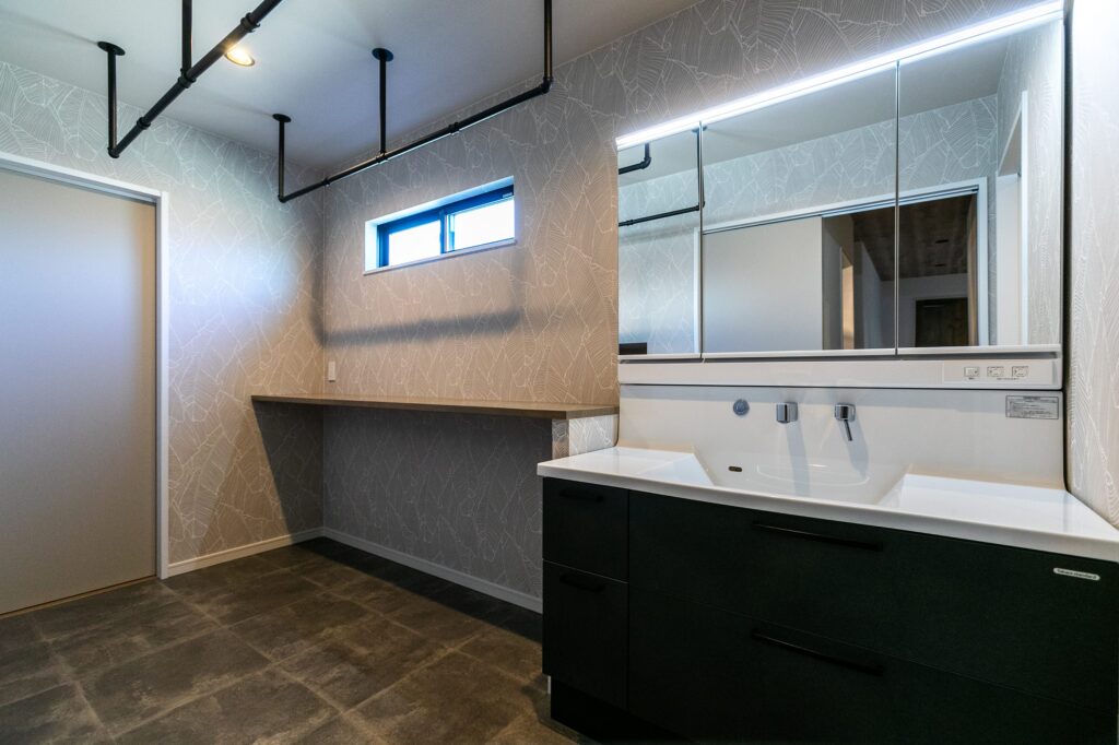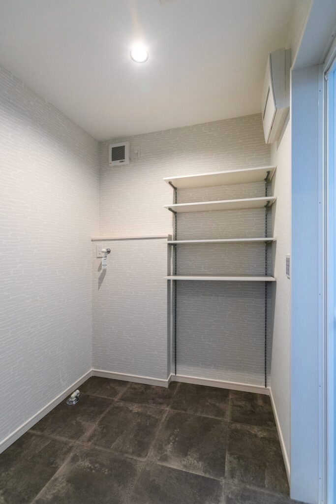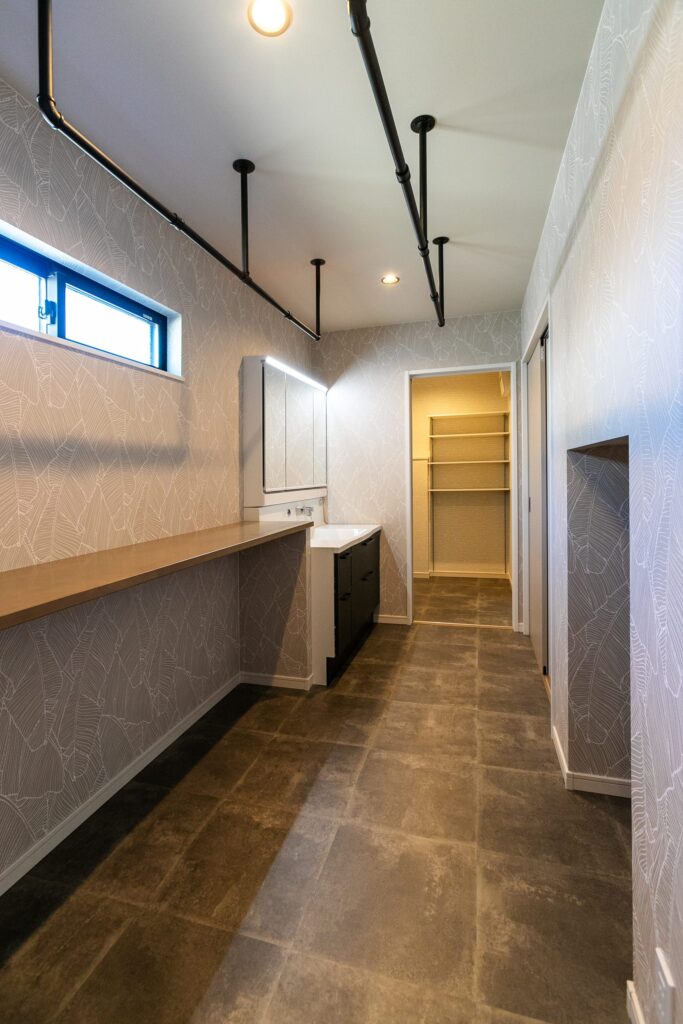 4帖のランドリールームには約2mのカウンターに、室内干しができるバーもついていて、洗濯、干す、畳むが可能♪