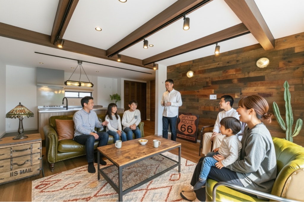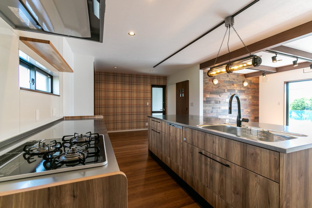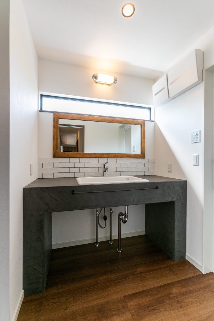 黄色いポストが映える、ブラックのカッコイイ外観です。 玄関ドアと軒天の木目が美しいですね! 広々としたガレージは、お車を収納したり 趣味のスペースとしても活用できます。 大胆な化粧梁に、本格的な板張りの壁と ヴィンテージな雰囲気溢れるこだわりの照明が とても素敵なリビングダイニングです。 キッチンは、作業スペースや収納場所を多くとれる ii型のスタイルでストレスフリーなデザインに^^ 壁にところどころ見えるこちらの穴は 猫ちゃん用の通路!なんて可愛らしいんでしょう♪ 左官で仕上げたこだりの洗面台は、触り心地も気持ち良い♪ 身支度の準備も楽しくできそうです(●^^●)